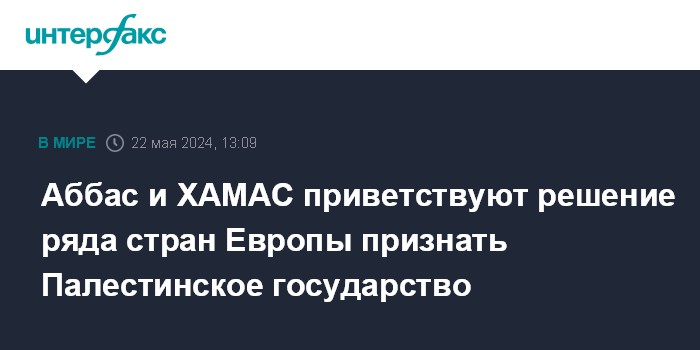 Москва. 22 мая. INTERFAX.RU - Глава Палестинской национальной администрации Махмуд Аббас приветствовал решение властей Испании, Ирландии и Норвегии признать государство Палестина, сообщает в среду агентство EFE.
