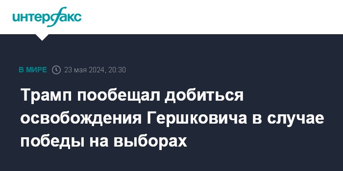 Москва. 23 мая. INTERFAX.RU - В случае победы на президентских выборах США, которые пройдут в ноябре 2024 года, Дональд Трамп пообещал добиться освобождения американского журналиста Эвана Гершковича из российского СИЗО, сообщает в четверг The Hill.