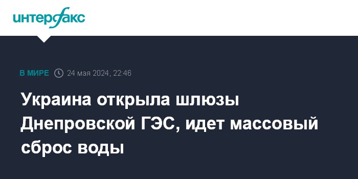 Москва. 24 мая. INTERFAX.RU - Власти Херсонской области сообщили о массовом сбросе воды в нижнее течение Днепра после открытия шлюзов Днепровской ГЭС (Днепропетровская область Украины).