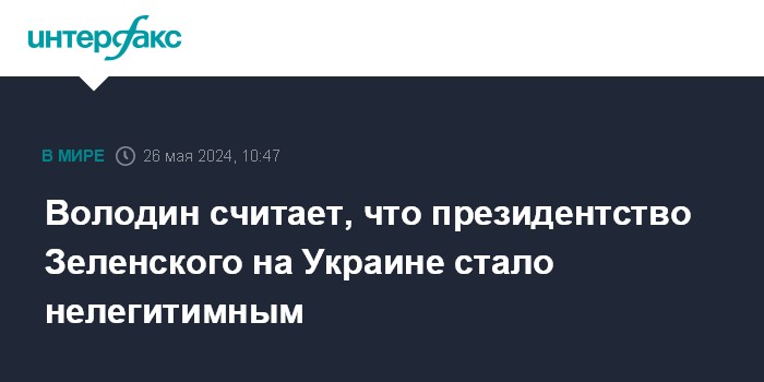 Москва. 26 мая. INTERFAX.RU - Председатель Госдумы Вячеслав Володин заявил, что у Владимира Зеленского завершилось право выступать от имени Украины с окончанием срока полномочий президента.
