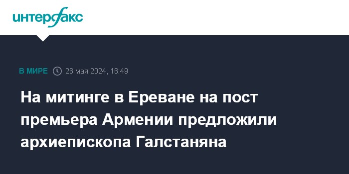 Москва. 26 мая. INTERFAX.RU - Оппозиционный митинг в центре Еревана предложил на пост премьера Армении кандидатуру представителя Тавушской епархии Армянской апостольской церкви архиепископа Баграта Галстаняна, возглавляющего протестное движение против действующих властей.
