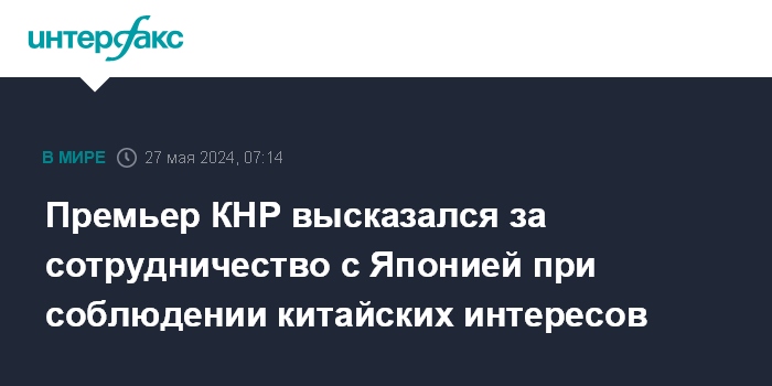 Москва. 27 мая. INTERFAX.RU - Премьер Госсовета КНР Ли Цян на встрече с премьер-министром Японии Фумио Кисидой заявил о готовности к развитию отношений между странами на основе консенсуса, достигнутого на встрече главы японского кабинета с китайским лидером Си Цзиньпином в Сан-Франциско в ноябре прошлого года.