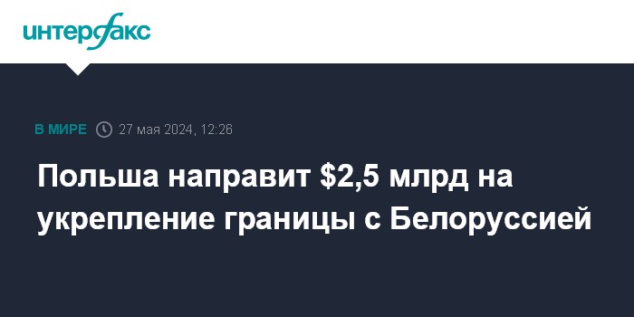 Москва. 27 мая. INTERFAX.RU - Польша направит $2,5 млрд на укрепление границы с Белоруссией в рамках программы Tarcza Wschod ("Восточный щит"), сообщил в понедельник министр национальной обороны Польши Владислав Косиняк-Камыш.