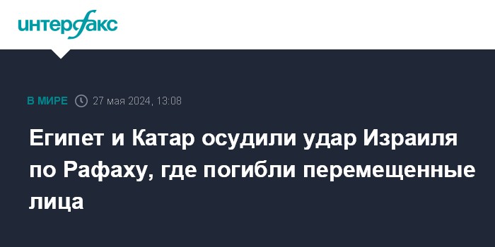 Москва. 27 мая. INTERFAX.RU - Египет и Катар в понедельник подвергли жесткой критике израильский обстрел объектов в Рафахе, в результате которого погибли не менее 50 человек, сообщает агентство EFE.