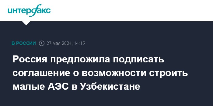 Москва. 27 мая. INTERFAX.RU - Россия предлагает зафиксировать в межправительственных документах возможность строительства АЭС малой мощности в Узбекистане, об этом говорится в опубликованном распоряжении правительства России.