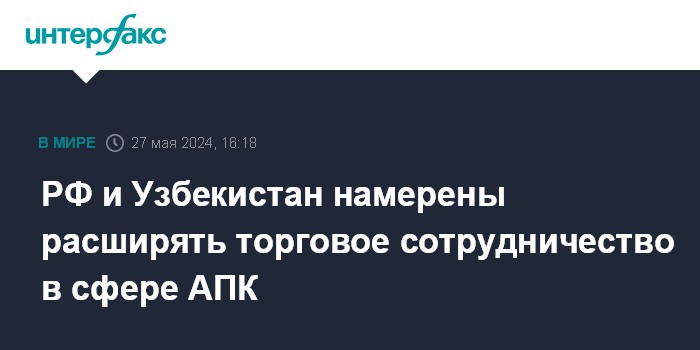 Москва. 27 мая. INTERFAX.RU - РФ и Узбекистан будут расширять торговое сотрудничество в торговле продукцией АПК.