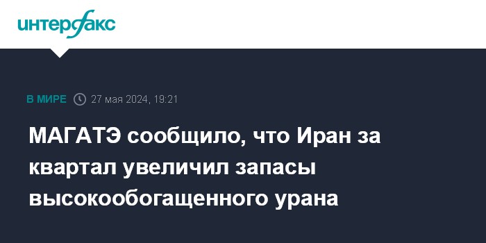 Москва. 27 мая. INTERFAX.RU - Тегеран за квартал вновь увеличил запасы обогащенного до 60% урана – на 20,6 кг по сравнению с данными на момент февральского отчета МАГАТЭ. Об этом сообщает Associated Press со ссылкой на квартальный доклад этого агентства.