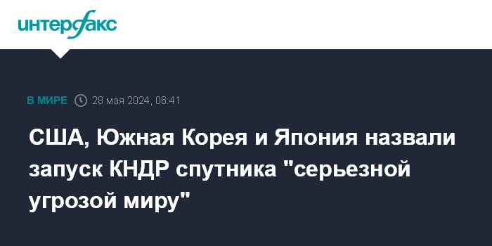 Москва. 28 мая. INTERFAX.RU - Представители Южной Кореи Ли Чжун Иль, США Чон Пак и Японии Хироюки Намадзу, отвечающие за вопросы, связанные с КНДР, в ходе телефонных переговоров назвали запуск Пхеньяном ракеты со спутником "нарушением резолюций ООН и серьезной угрозой миру", сообщает южнокорейский МИД.
