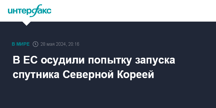 Москва. 28 мая. INTERFAX.RU - ЕС решительно осуждает попытку запуска 27 мая спутника КНДР с использованием баллистических военных технологий, заявил официальный представитель Европейской внешнеполитической службы (ЕВС).