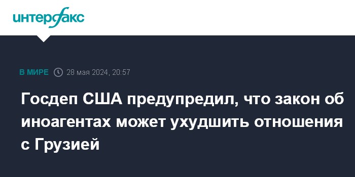 Москва. 28 мая. INTERFAX.RU - Власти США разочарованы одобрением в Грузии закона "О прозрачности иностранного влияния" и предупреждают о возможных отрицательных последствиях для отношений между Тбилиси и Вашингтоном, заявил представитель госдепартамента США Мэтью Миллер.