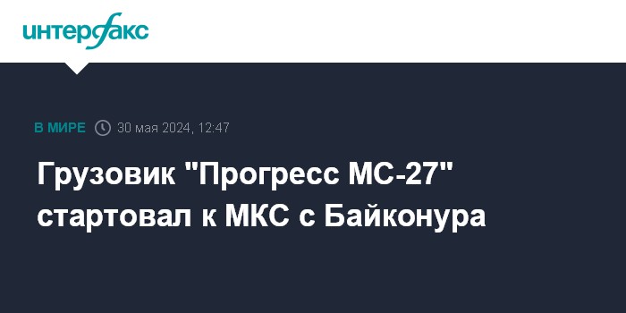 Москва. 30 мая. INTERFAX.RU - Ракета-носитель "Союз-2.1а" с транспортным грузовым кораблем "Прогресс МС-27" стартовала с космодрома Байконур, следует из трансляции "Роскосмоса".