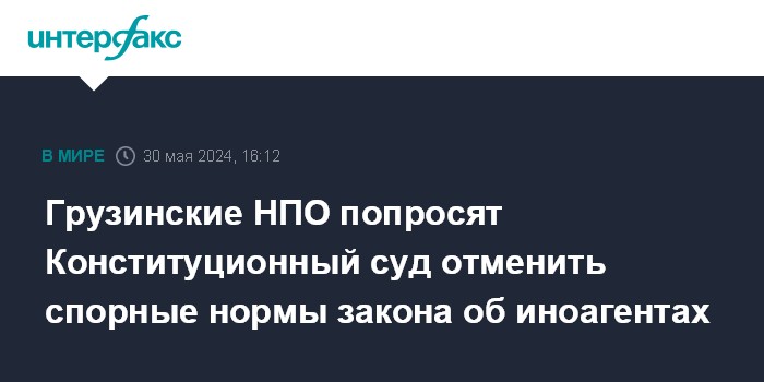 Москва. 30 мая. INTERFAX.RU - Грузинские неправительственные организации продолжат борьбу против принятого парламентом закона "О прозрачности иностранного влияния" с использованием всех внутренних и международных механизмов и в ближайшее время подадут иск в Конституционный суд страны, говорится в совместном заявлении нескольких десятков НПО.