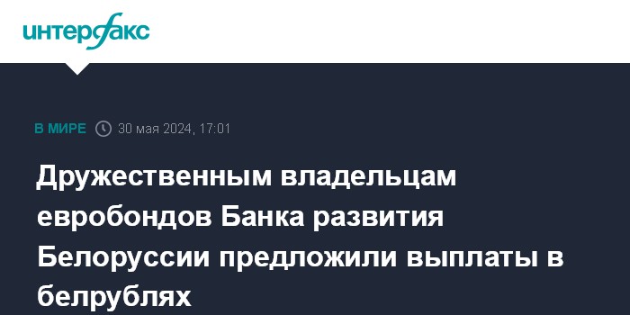 Москва. 30 мая. INTERFAX.RU - Держатели еврооблигаций Банка развития Республики Беларусь (БРРБ) из дружественных стран могут получить выплаты по ним в белорусских рублях, сообщил белорусский Минфин.