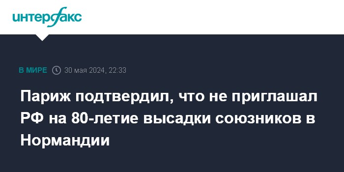 Комментируя это сообщение, пресс-секретарь президента РФ Дмитрий Песков заявил, что никаких официальных приглашений от Франции на празднование, посвященное 80-летию высадки союзников в Нормандии, Россия не получала.