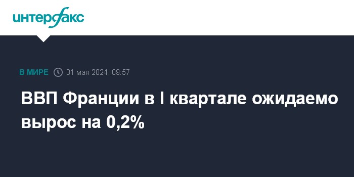 Москва. 31 мая. INTERFAX.RU - Объем ВВП Франции в первом квартале увеличился на 0,2% по сравнению с предыдущими тремя месяцами. Об этом говорится в отчете национального статистического института Insee, представившего окончательные данные.