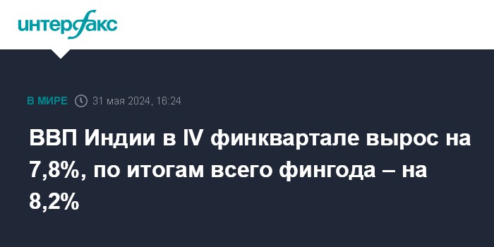 Москва. 31 мая. INTERFAX.RU - ВВП Индии в четвертом финансовом квартале (январь-март) увеличился на 7,8% по сравнению с аналогичным периодом предыдущего года, говорится в отчете министерства статистики страны.
