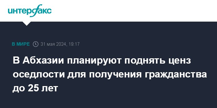 Москва. 31 мая. INTERFAX.RU - Парламент Абхазии в первом чтении принял поправку в закон "О гражданстве", предполагается увеличение срока непрерывного проживания в республике с 10 до 25 лет для получения гражданства.