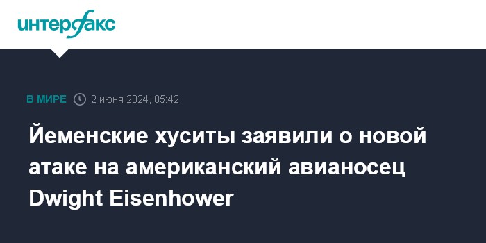 Москва. 2 июня. INTERFAX.RU - Йеменские хуситы повторно атаковали авианосец ВМС США Dwight Eisenhower, а также американский эсминец, заявил военный представитель группировки Яхья Сари.