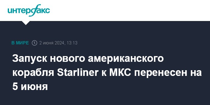 Москва. 2 июня. INTERFAX.RU - Очередная попытка запуска нового американского многоразового пилотируемого космического корабля CST-100 Starliner корпорации Boeing, который был отмен в субботу за три минуты до старта, будет предпринята не ранее 5 июня, сообщило НАСА.