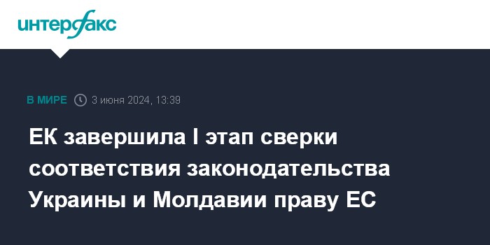 Москва. 3 июня. INTERFAX.RU - Еврокомиссия завершила разъяснительные сессии с Украиной и Молдавией как странами-кандидатами на вступление в Еврсоюз, сессии были первой частью процесса проверки соответствия их законодательства праву ЕС.