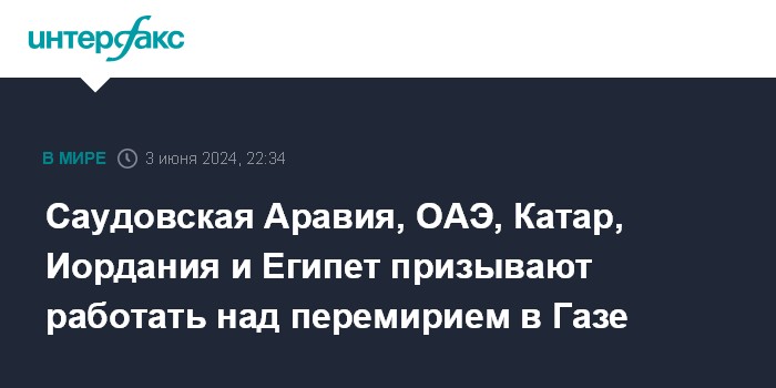 Москва. 3 июня. INTERFAX.RU - Главы МИД Саудовской Аравии, ОАЭ, Катара, Иордании и Египта заявили в понедельник о положительном отношении к предложенному на прошлой неделе президентом США Джо Байденом плану установить перемирие в Газе, сообщает саудовское издание Arab news.