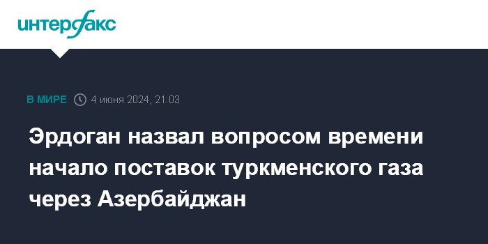 Москва. 4 июня. INTERFAX.RU - Президент Турции Реджеп Тайип Эрдоган считает начало поставок туркменского газа в Турцию и Европу через территорию Азербайджана вопросом времени.