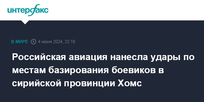 Москва. 4 июня. INTERFAX.RU - ВКС России уничтожили два места базирования боевиков в труднодоступных горных районах в провинциях Хомс, заявил замруководителя российского Центра по примирению враждующих сторон (ЦПВС) в Сирии генерал-майор Юрий Попов.
