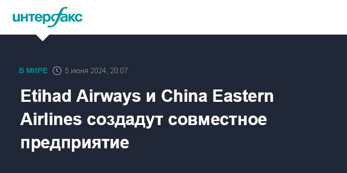 Москва. 5 июня. INTERFAX.RU - Авиакомпания Etihad Airways из ОАЭ и китайская China Eastern Airlines подписали соглашение о создании совместного предприятия (СП), в рамках которого они будут делить выручку на некоторых маршрутах, пишет MarketWatch.
