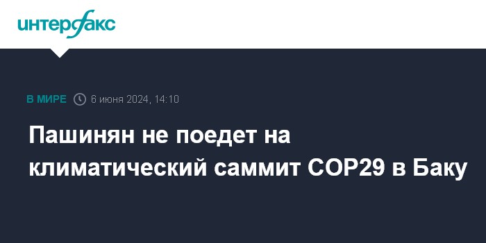 Москва. 6 июня. INTERFAX.RU - В Ереване опровергли информацию о готовящемся визите премьер-министра Армении Никола Пашиняна в Азербайджан для участия в саммите COP29.