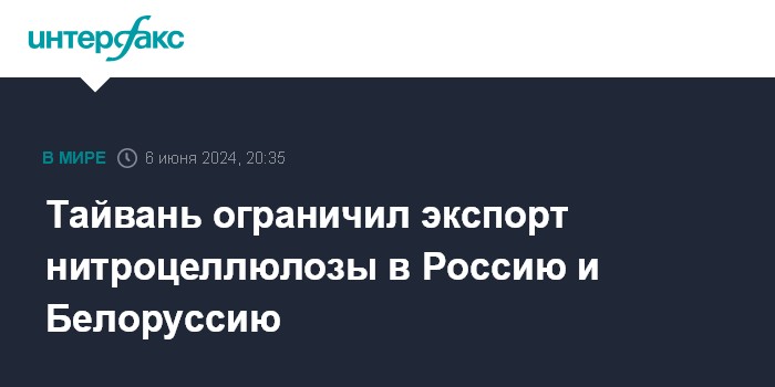 Москва. 6 июня. INTERFAX.RU - Министерство экономики Тайваня ограничило экспорт нитроцеллюлозы в Россию и Белоруссию, соответствующее решение опубликовано на сайте ведомства.