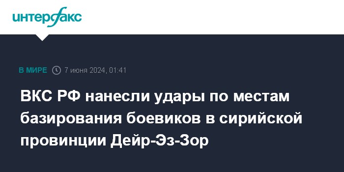 Москва. 7 июня. INTERFAX.RU - ВКС России нанесли удары по четырем местам базирования боевиков в горных районах в провинции Дейр-Эз-Зор, заявил замруководителя российского Центра по примирению враждующих сторон (ЦПВС) в Сирии генерал-майор Юрий Попов.