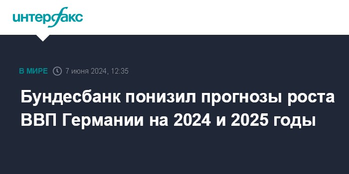Москва. 7 июня. INTERFAX.RU - Бундесбанк понизил прогнозы роста ВВП Германии на 2024 и 2025 годы, повысив при этом прогноз на 2026 год.