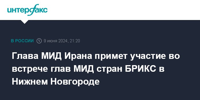 Москва. 9 июня. INTERFAX.RU - Исполняющий обязанности министра иностранных дел Ирана Али Багери примет участие в совещании глав МИД стран БРИКС, которое пройдет в Нижнем Новгороде, сообщает в воскресенье иранское агентство ИРНА.