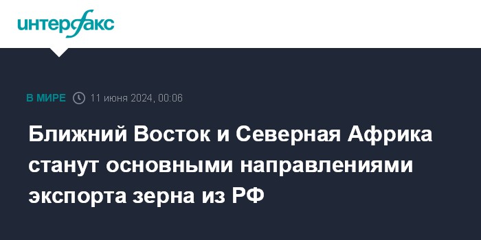 Москва. 10 июня. INTERFAX.RU - Страны Ближнего Востока и Северной Африки станут основными направлениями экспорта российского зерна, сообщает Минсельхоз по итогам совещания с экспортерами, которое в понедельник провела министр сельского хозяйства Оксана Лут.