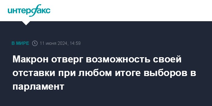 Москва. 11 июня. INTERFAX.RU - Президент Франции Эммануэль Макрон в интервью, опубликованном во вторник в Le Figaro, отверг возможность своей отставки, каким бы ни был итог объявленных им внеочередных выборов в Национальное собрание.