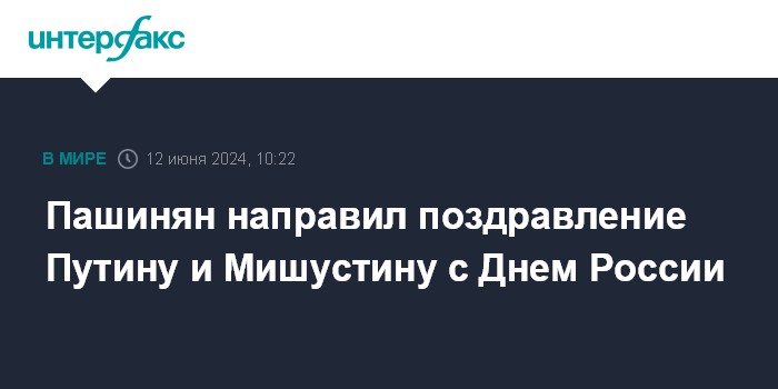 Пашинян направил поздравление Путину и Мишустину с Днем России