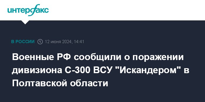 Москва. 12 июня. INTERFAX.RU - Российские военные ударом "Искандера" поразили дивизион зенитного ракетного комплекса (ЗРК) С-300ПТ вооруженных сил Украины (ВСУ) в Полтавской области, заявили в Минобороны РФ в среду.