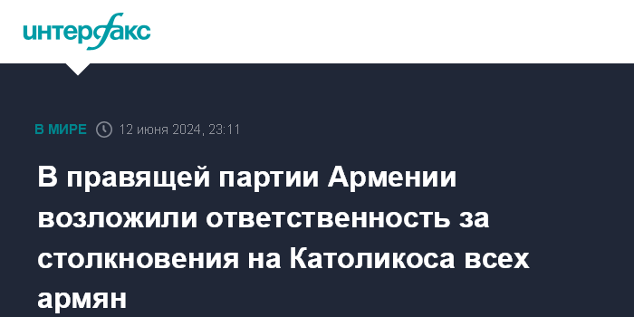 Москва. 12 июня. INTERFAX.RU - В возглавляемой премьером Армении Николом Пашиняном правящей партии "Гражданский договор" возложили ответственность за столкновения между демонстрантами и полицией на Католикоса всех армян Гарегина Второго.