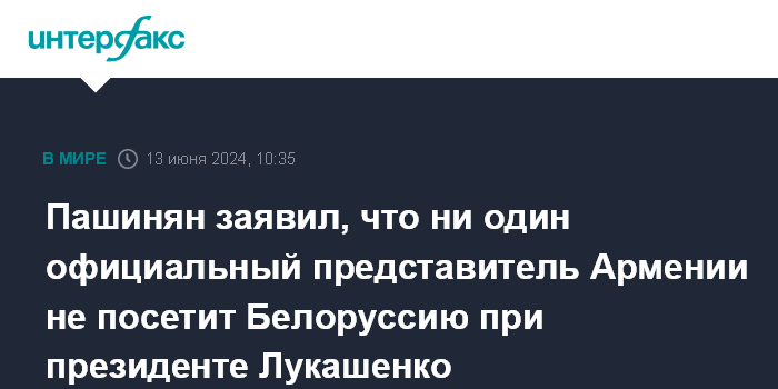 Москва. 13 июня. INTERFAX.RU - Премьер-министр Армении Никол Пашинян заявил, что ни он сам, ни один другой официальный представитель Армении никогда не посетит Белоруссию, пока руководителем этой страны является Александр Лукашенко.