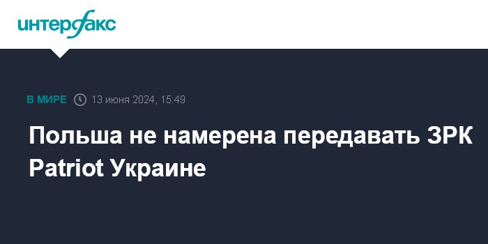 Москва. 13 июня. INTERFAX.RU - Варшава не давала согласия на передачу польской батареи ЗРК Patriot Украине, сообщил в четверг заместитель главы оборонного ведомства Польши Цезарий Томчик.
