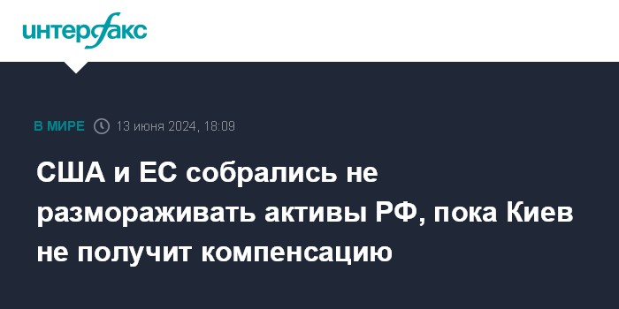 Москва. 13 июня. INTERFAX.RU - Американские и европейские официальные лица подтвердили готовность держать российские активы заблокированными, пока Москва "не выплатит репарации" Украине, сообщает Associated Press со ссылкой на американские источники.