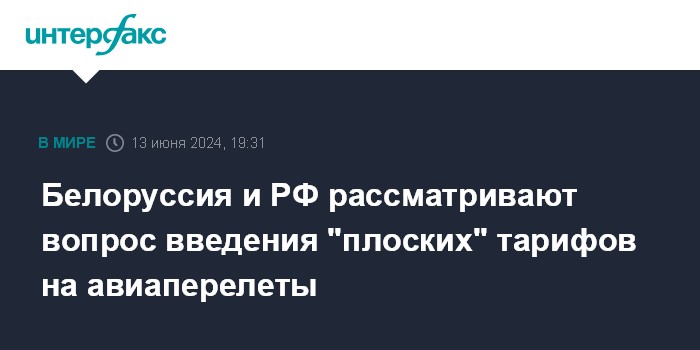 "Вопрос введения "плоских" тарифов на авиаперелеты между городами Беларуси и России по примеру авиационного сообщения между Москвой и городами Дальнего Востока рассматривается, он был обозначен на заседании Группы высокого уровня Совета министров Союзного государства в Смоленске", - сказал дипломат, которого цитирует госиздание "СБ. Беларусь сегодня".