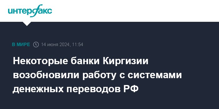 Москва. 14 июня. INTERFAX.RU - Часть коммерческих банков Киргизии возобновила работу с системами денежных переводов России и с российскими рублями.