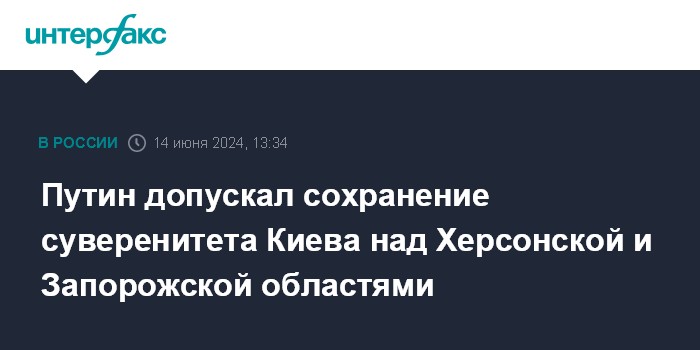 Москва. 14 июня. INTERFAX.RU - Россия не исключала сохранения суверенитета Киева над Херсонской и Запорожской областями при предоставлении России сухопутного коридора в Крым, заявил на встрече с руководством российского МИД президент Владимир Путин.