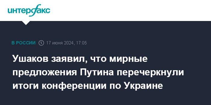 Москва. 17 июня. INTERFAX.RU - Мирные предложения президента РФ Владимира Путина по украинскому урегулированию, озвученные им 14 июня, перечеркнули итоги состоявшейся 15-16 июня в швейцарском Бюргенштоке конференции по Украине, заявил помощник главы государства Юрий Ушаков.