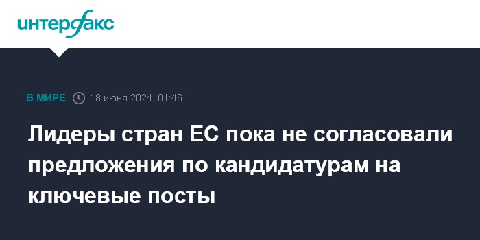 Москва. 18 июня. INTERFAX.RU - Лидеры государств и правительств стран ЕС на неформальном саммите в Брюсселе не согласовали предложения о назначениях на ключевые посты в Евросоюзе, заявил журналистам председатель Евросовета Шарль Мишель.