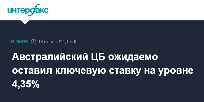 Москва. 18 июня. INTERFAX.RU - Резервный банк Австралии (RBA) сохранил ключевую процентную ставку на уровне 4,35% годовых по итогам завершившегося во вторник заседания.