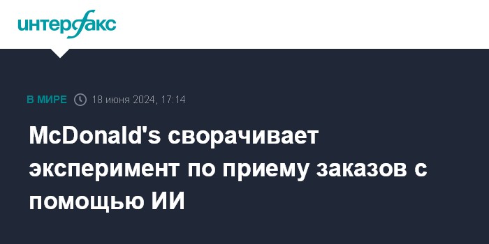 Москва. 18 июня. INTERFAX.RU - Американская McDonald's Corp. прекращает совместный с IBM двухлетний ИИ-эксперимент по автоматизации обслуживания (automated order taking, AOT) автомобилистов в формате drive-through (без выхода из машины), пишет журнал Restaurant Business со ссылкой на электронное письмо McDonald's в адрес своих франчайзи.