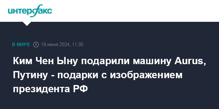 Москва. 19 июня. INTERFAX.RU - Президент РФ Владимир Путин и председатель КНДР Ким Чен Ын обменялись подарками: корейскому лидеру преподнесли новый автомобиль Aurus и сервиз, несколько художественных произведений с собственным изображением преподнесли Путину, сообщил помощник президента РФ Юрий Ушаков.