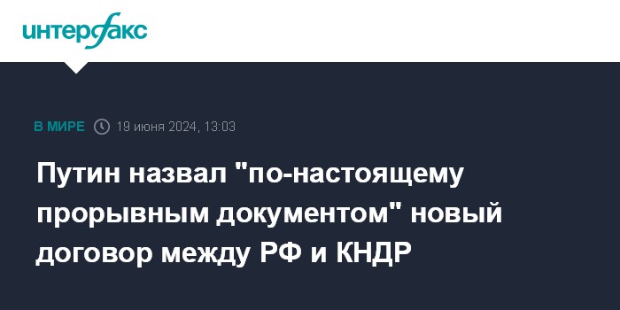 Москва. 19 июня. INTERFAX.RU - Президент России Владимир Путин назвал подписанный Договор о всеобъемлющем стратегическом партнерстве между РФ и КНДР прорывным документом, который позволит странам поднять взаимодействие на новый уровень.